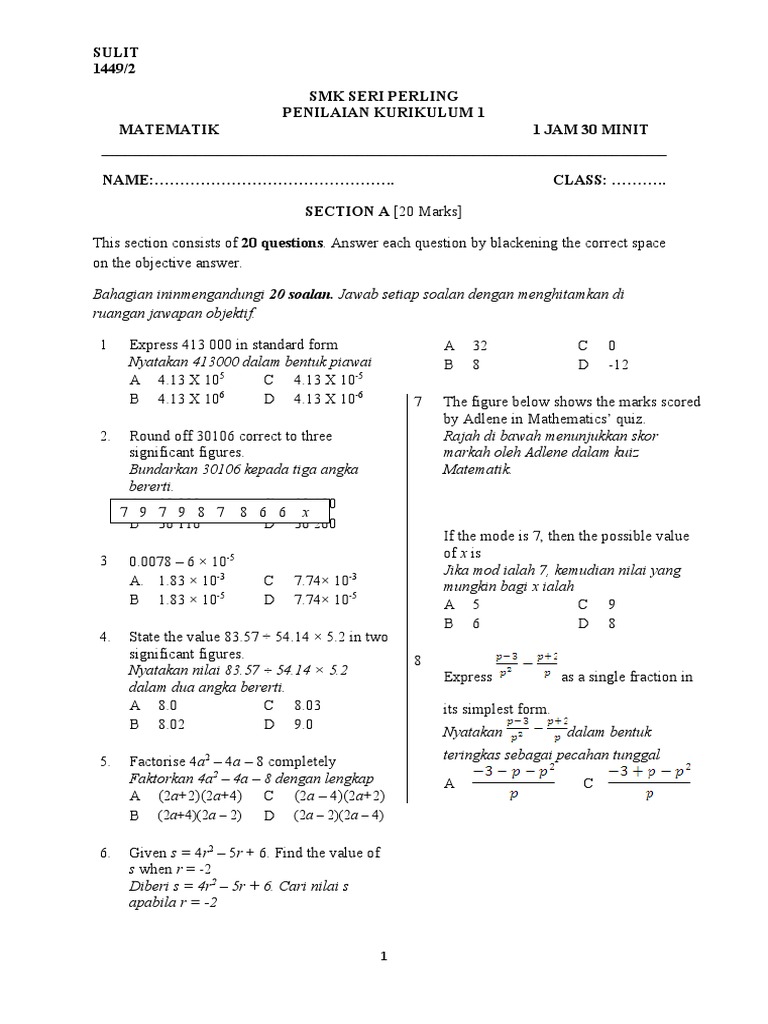 SULIT NAMA KELAS PEPERIKSAAN PERTENGAHAN TAHUN 2013 TINGKATAN 4 MATEMATIK Kertas 2 𝟐 𝟏 𝟐 jam Dua jam Tiga puluh minit JANGAN BUKA KERTAS SOALAN INI SEHINGGA DIBERITAHU 1. Bab 3 online worksheet for tingkatan 4. PEPERIKSAAN AKHIR TAHUN TINGKATAN 4 SETARA DAERAH JOHOR BAHRU-KERTAS 1.